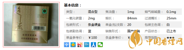 类型 :混合型 焦油量 :1mg 烟气烟碱量 :0.1mg 一氧化碳量 :2mg