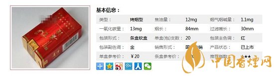 | 类型 :烤烟型 | 焦油量 :12mg | 烟气烟碱量 :1.1mg | 一氧化碳量 :13mg |