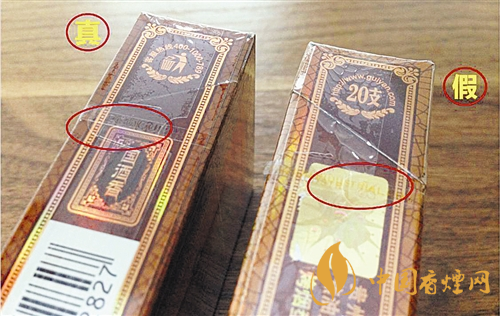 假冒:非常粗糙,方向错位,位于烟盒的左侧。