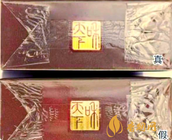 真品商标纸采用复合镭射银卡纸,胶印和丝网印刷,“和天下”字体采用压凸烫金工艺,用手摸凹凸感较明显,且字体笔画较粗,商标纸上字体、拼音、花纹看上去有较清晰的竖线;假烟采用高清扫描仿制印刷,“和天下”字体用手摸凹凸感不明显,且字体笔画较细,商标纸上拼音、花纹等处竖线较模糊,与真品特征存在明显差异。