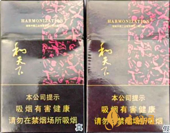 真烟底部采用全息防伪,用放大镜可看到由“HARMONIZATION”微缩字组成的“和天下”版面图案,且“和天下”字体笔画较粗;假烟的全息防伪没有立体感,用放大镜看“HARMONIZATION”微缩字较模糊,且“和天下”字体笔画较细,与真品特征存在明显差异。