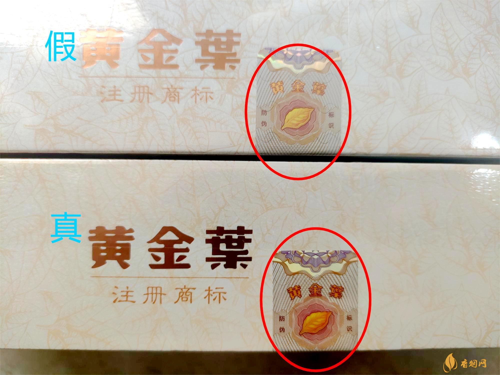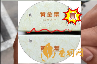 1.看条盒正面商标纸印刷:真烟商标纸采用胶印印刷,“黄金葉”三个字采用压凸烫金工艺,字体笔画饱满清晰且较粗,底纹透明度好,图案清晰,层次感强;假烟采用高清扫描仿制印刷,“黄金葉”三个字笔画较细且边缘较粗糙,底纹极不清晰。