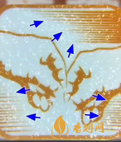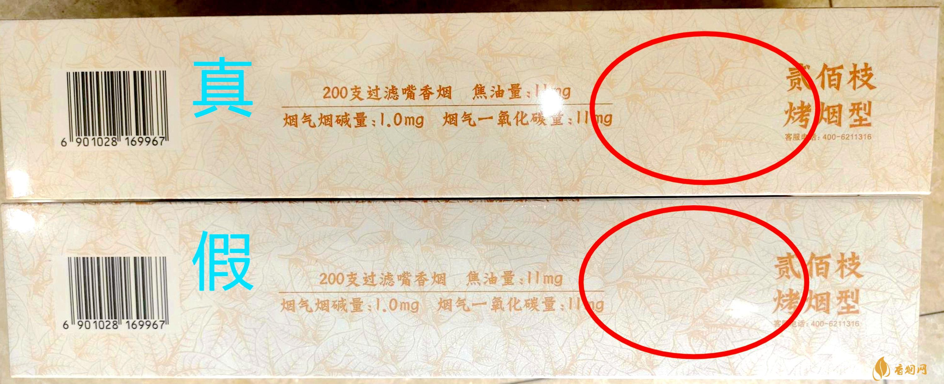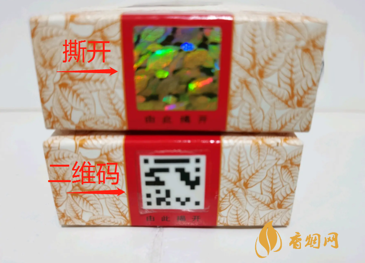 3.看条盒侧面防伪签:真烟封签纸中烟叶外围的红色花瓣图案以及外围部分,采用超细线防伪,图案线条清晰,色彩明暗对比明显;假烟线条模糊,色彩对比不强烈。