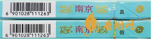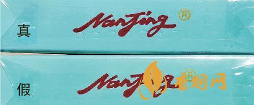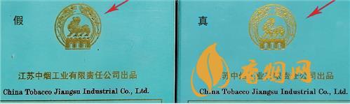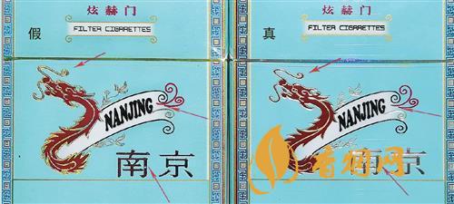 商标纸正面工艺对比:真烟印刷质量好,图案无重叠且非常清晰,“NANJING”字样摸起来有凹凸感,“南京”字样不漏金,且清晰有光泽,;假烟“NANJING”字样摸起来无凹凸感,“南京”字体漏金且暗淡无光。