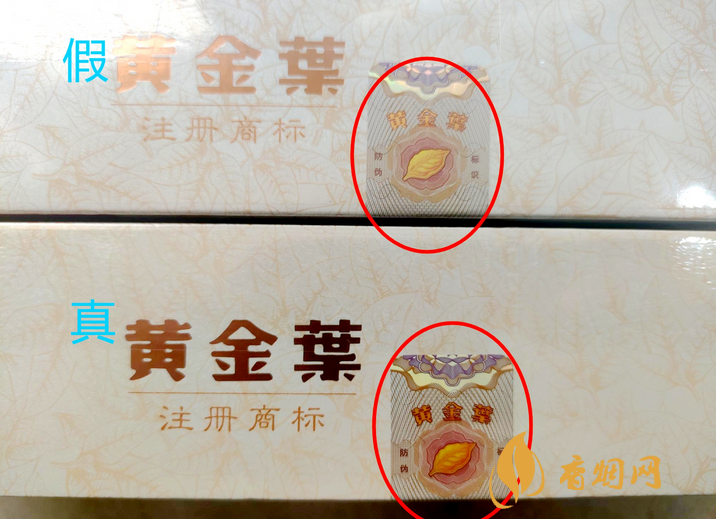 烟盒正面对比:真烟小盒的颜色要比假烟的颜色深,贴近米色,中间部位叶子的纹路颜色较深,真烟“黄金叶”3个字摸上去有印刷工艺产生的凹凸感。假烟小盒颜色有的较浅,中间部位叶子的纹路模糊,且印刷工艺缺少磨砂立体感。