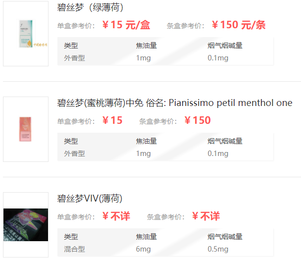 目前已知pianissimo香烟在国内市场上有三种香烟,分别是碧丝梦(绿薄荷)、碧丝梦(蜜桃薄荷)以及碧丝梦VIV(薄荷)。