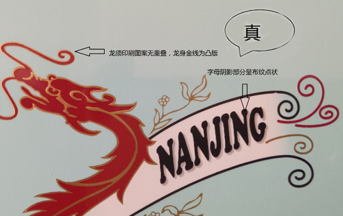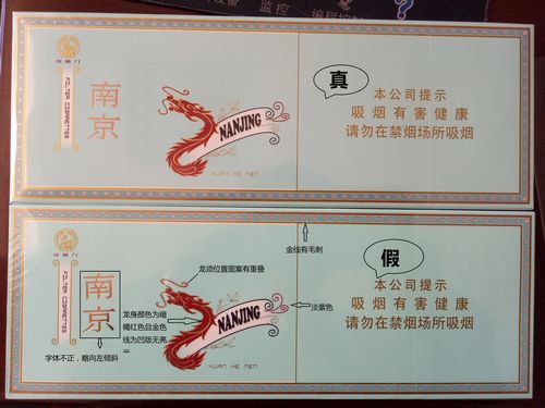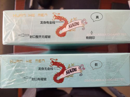看条盒颜色,真烟为淡蓝色,颜色柔和纯正;假烟为浅蓝色,视觉上颜色不是自然色。看条盒图标,真烟“南京”二字字体端正清晰,龙须印刷图案无重叠,龙身金线为凸版,条盒金边无毛刺;假烟“南京”二字字体向左微倾,龙须有叠痕错层,龙身颜色为褐红色、金线为凹版,条盒金边有毛刺。
