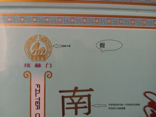 假烟右上角狮子图标模糊不清,字体有毛刺。