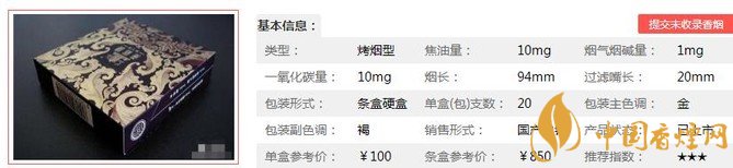 | 类型 :烤烟型 | 焦油量 :10mg | 烟气烟碱量 :1mg | 一氧化碳量 :10mg |