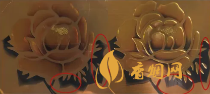 假烟:底部钢印深浅一致,无渐变效果;烫金图案不清晰,边缘有毛边现象,污垢痕迹明显。