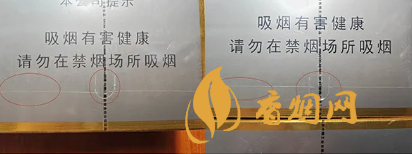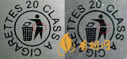 假烟:环保标志小人上下半身接缝处为一个规则的长方形;镭射标左宽右窄,圆形不规则。