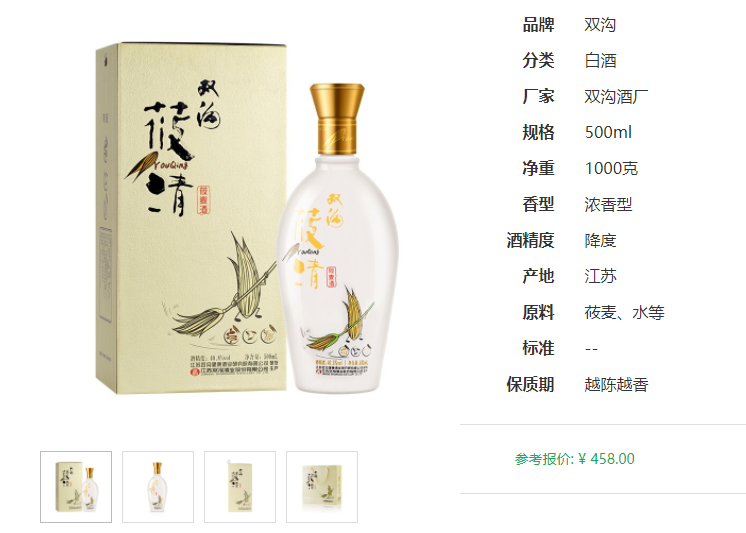 双沟莜清酒是江苏洋河酒厂股份历时五年研制而成的新品,是一款健康、养生的新型白酒,具有养心护肝降三高的特点。双沟莜清系列产品在市面上流通的主要分为双沟莜清(荞麦酒)、双沟莜清(燕麦酒)、双沟莜清(莜麦酒)三款。