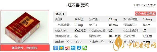 | 类型 :烤烟型 | 焦油量 :11mg | 烟气烟碱量 :1.1mg | 一氧化碳量 :12mg |