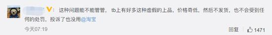 对此,有网友表示,这种问题能不能管管, tb上有好多这种虚假的商品,价格奇低,然后不发货,也不会受到任何的处罚,投诉了也没用。