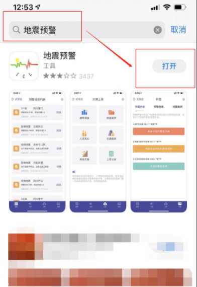 1、使用iPhone的用户点击打开AppStore在上方搜索栏输入地震预警,在搜索结果页面点击下载这个app。