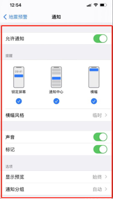 4、将这个页面按图中这样设置,设置完成后在地震发生时,iPhone手机上就会收到预警提醒了。