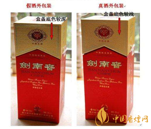 二、重点从商标标签上鉴别1、 真品剑南春酒标签主要特征:(1)正标标签上“剑南春”三个字,“注册商标标识、外花边”、“jian nan chun chiew”剑南春酒拼音均有凸凹感,印刷套印比较准确,线条清晰,字体边缘不毛,轮廓清楚。(2)小字体:酒精度、净含量、厂名、厂址和简介,这些字体很清晰、均匀、无断裂,边缘颜色协调。(3)背标标签:背标标签鉴别主要从简介内容及印刷字体入手,字体清楚、不毛边,边缘颜色协调。2、 假冒剑南春酒标签的特点(1) 正标标签上凸凹感不明显;(2)字体套印不准确,线条不均匀,字体有毛边和粗细不匀等现象;(3)小字体不清晰和模糊现象严重;(4)背标标签边缘颜色与背标整体不协调。