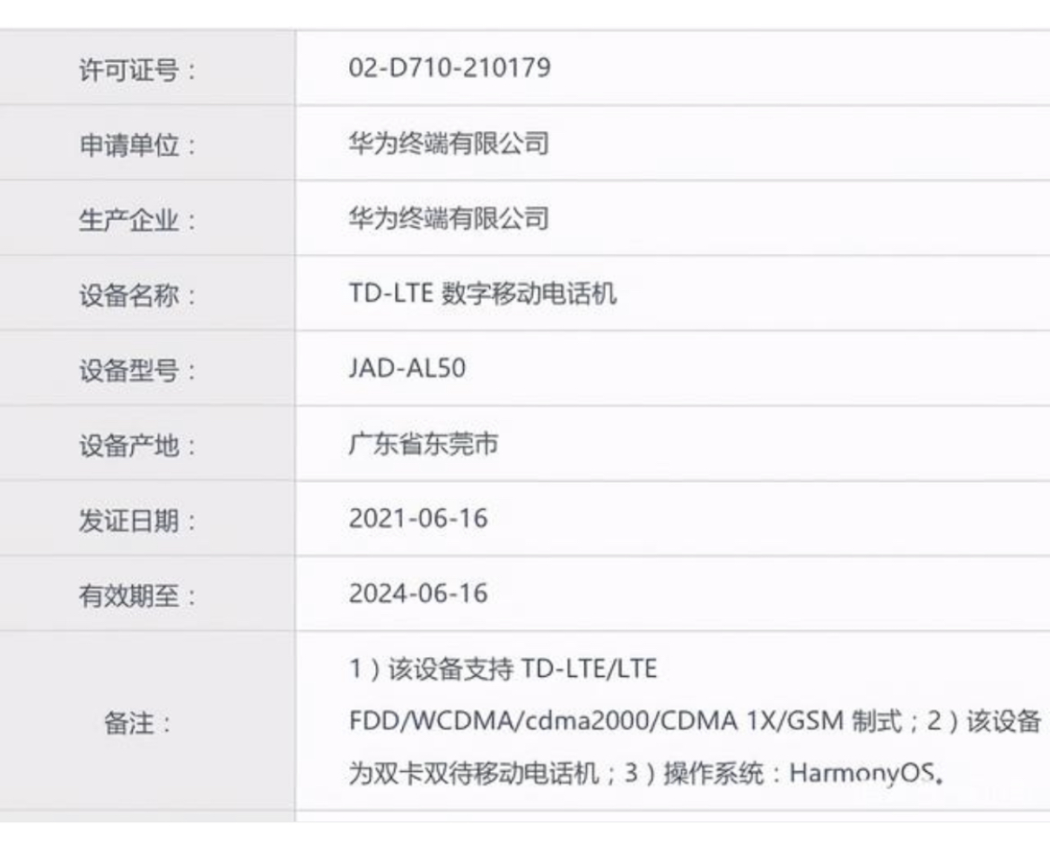 一款型号为 JAD-AL50 的华为 TD-LTE 数字移动电话机现已通过 3C 认证,配备 66W 充电器。3C 认证显示,这款手机申请人、制造商为华为终端有限公司,生产厂为华为机器有限公司,首次发证日期为 7 月 1 日。