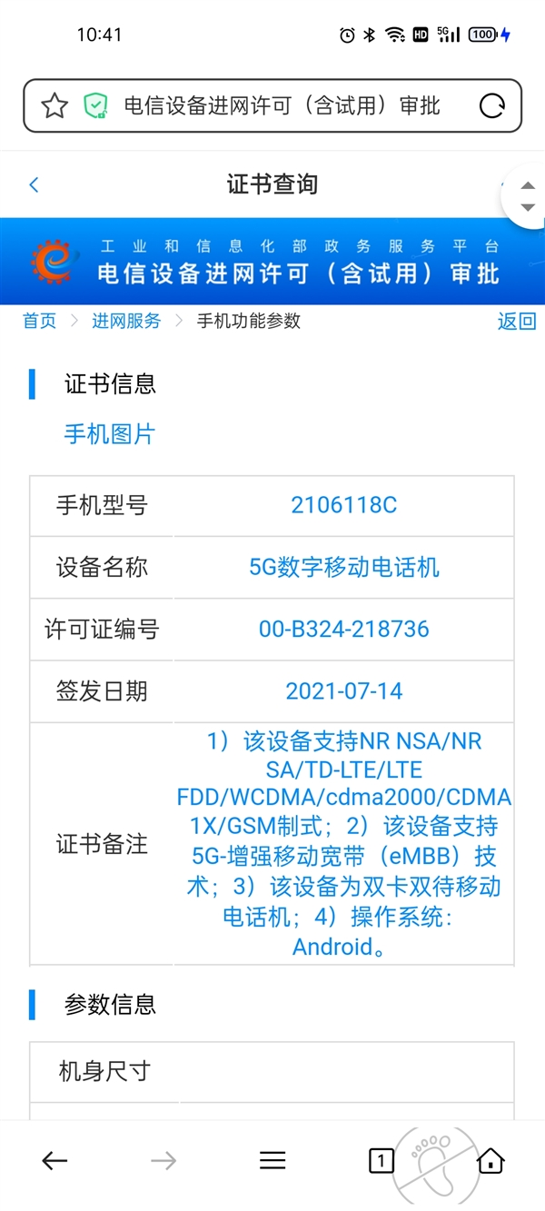 今日,这款新机的入网许可证也终于被网友曝光,从许可证信息上可以看到,该机的具体型号为2106118C,支持5G-增强移动宽带(eMBB)技术,双卡双待,操作系统为Android。