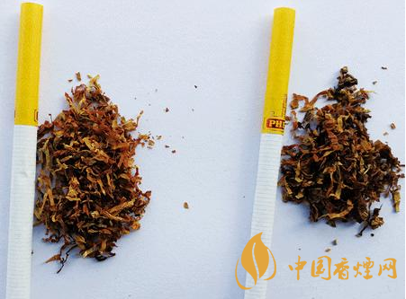 烟支及烟丝差异对比:真烟烟支黄色接装纸长度为30mm,烟丝切丝宽度均匀,烟丝疏松、光泽油润性好,呈柠檬黄色,烟丝结构为叶丝和少量造纸法再造烟叶;假烟烟支黄色接装纸较长为32mm,烟丝切丝宽度不匀,光泽油润性较差,烟丝结构为叶丝和膨胀梗丝,与真品特征存在明显差异。