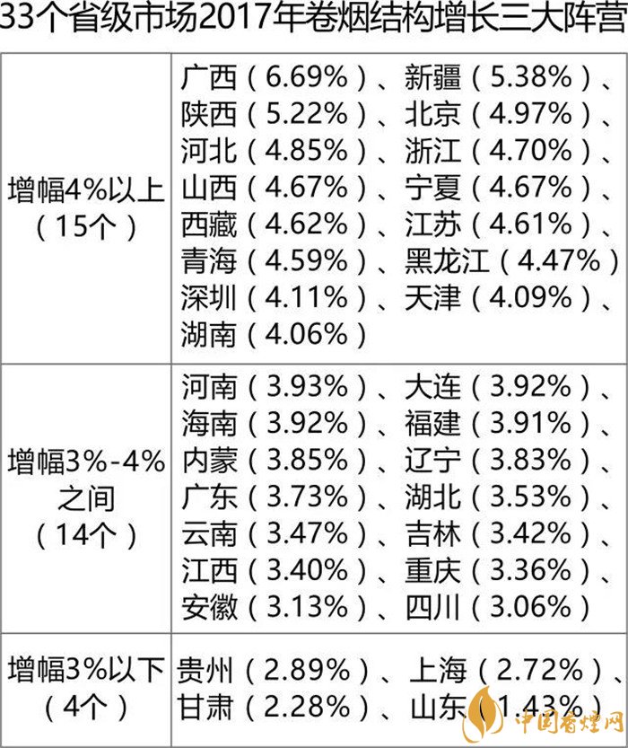 结构升级既是行业所愿,也是大势所趋。其中,有几个值得进一步观察的现象:一是单箱值迈入3万元的省级市场已达15个,总体以华东、华南、西南两大区域为主(北方只有北京市)。二是一类烟成为结构提升的主动力,全年一类卷烟销量1058.60万箱,同比增加70.35万箱,增长7.11%。三是有8个省级市场单箱结构同比增加值没有达到1000元,分别是山东、甘肃、吉林、贵州、辽宁、四川、内蒙和黑龙江,其中,山东烟民消费最不给力,仅增加360元。四是结构最高的仍然是浙江,单箱值达到43663元,最低的仍然是河北,单箱值为22375元,相差接近一倍。