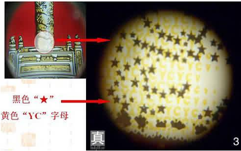 (3)真烟中华logo的华表根部用放大镜观看,会发现上面的小点点是五角星,同时中间夹杂着YC的英文微缩字母, 原产地标识放大后的图片也是非常的容易鉴定,里面可以看到tian~an-door等微缩信息。