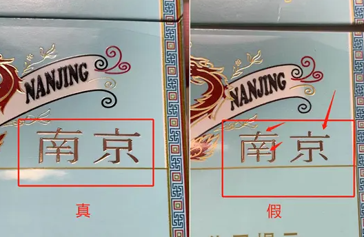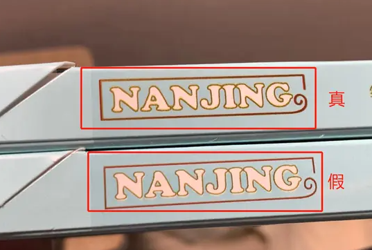 下来我们看看盒子的右侧,真烟的条码和南京字样印刷清晰,假烟则是模糊不清,另外字体两边的图案仔细看也能看出端倪。
