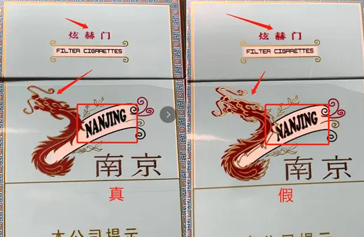 正面的细节,我们可以看到烟盒上方炫赫门三个字,真烟同样是字迹清晰,假烟是模糊的。盒子正面的龙的图案大家可以看到同样是暗红色,假烟的暗红的不够深沉,而龙图案轮廓的金线,假烟就比较明显了,金线和龙的图案都不重合,假烟做成这样来说比较好识别。另外正面NANJING的拼音真烟看起来也是清晰的,底部还有很清晰的小黑点底纹,假烟的底纹就是模糊的一片,有些甚至没有底纹。