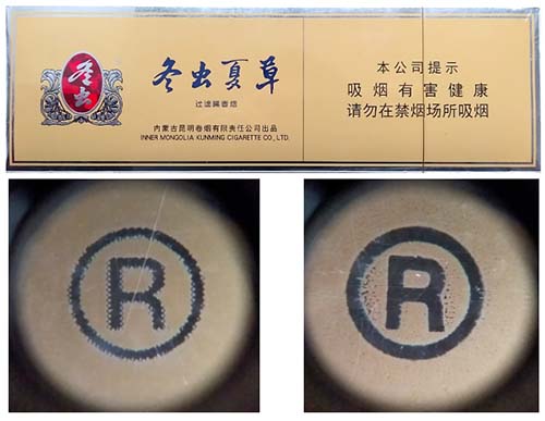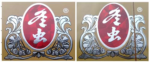 2.注册商标图案。真品卷烟采用起凸工艺商标印刷,图案细节起凸完美,眼观、手摸凹凸感明显。该款假冒卷烟商标印刷起凸工艺较差,部分细节未做起凸,手摸图案平滑。(左真右假)