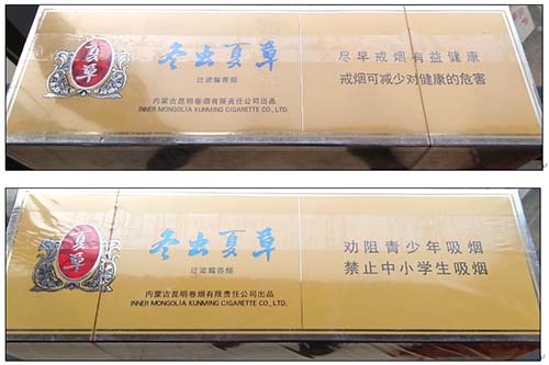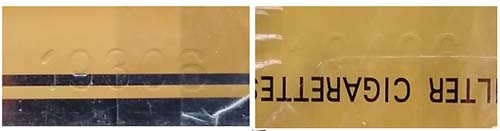 1.商标字体印刷。真品卷烟商标印刷采用“凹印”,两种颜色交界边缘呈现虚边或锯齿状。假冒卷烟商标印刷一般采用“胶印”,两种颜色交界边缘比较清晰、光滑,无锯齿状。(左真右假)