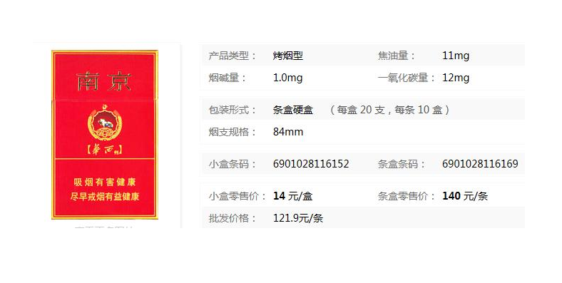 | 类型 :烤烟型 | 焦油量 :11mg | 烟气烟碱量 :1mg | 一氧化碳量 :12mg |