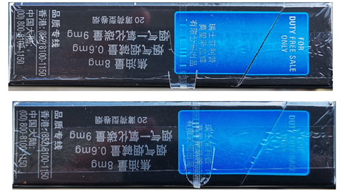 真品卷烟的免税封签印刷图案清晰,层次分明。“免税专卖”字体清晰可辨;超线图案线条清晰,层次分明。假冒卷烟的免税封签图案和字体模糊、色彩黯淡,图案套印有偏差。