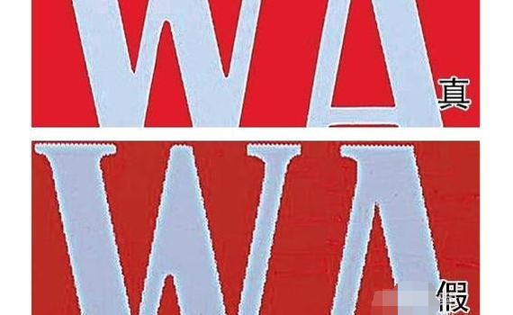 1,观察侧边商标字体,真烟的话,此处字体边缘处干净,且与周边红色对比明显。而假烟由于印刷工艺的问题,字体边缘有脱色现象,字母看上去也比较粗大一些。
