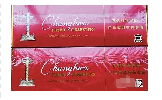 3,真品中华烟天安门图案,印刷细致,“中华”字样烫金准确,金镶白的字体设计套色清晰,边缘整齐,层次分明。而假烟天安门图案印刷粗糙,“中华”边缘处有缺色少漆现象,主次不分明。