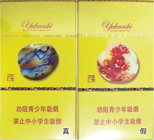小盒背面图案差异对比:真烟雨花石图案用手指摸上去凸起感强烈,石头颗颗分明;假烟雨花石图案用手指摸上去凸起感不强,无立体感。