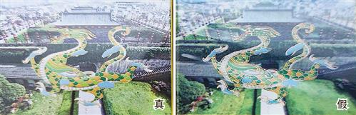 小盒正面图案印刷差异对比:真烟小盒正面图案草坪、台阶、屋顶瓦片清晰连贯;假烟小盒正面草坪、台阶、屋顶瓦片模糊不清,时有时无。