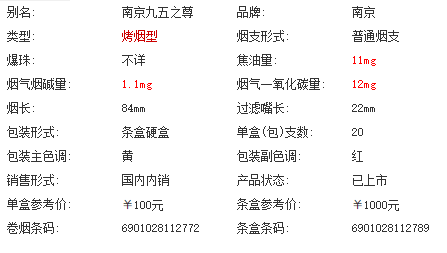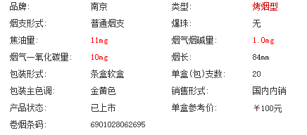 | 类型 :烤烟型 | 焦油量 :11mg | 烟气烟碱量 :1.1mg | 一氧化碳量 :12mg |