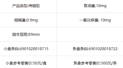 | 类型 :烤烟型 | 焦油量 :11mg | 烟气烟碱量 :1mg | 一氧化碳量 :11mg |