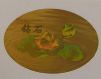 1、钻石(荷花),防伪标识为哑光动态效果,钻石文字呈浮雕效果,标识在不同光线角度下,可观测到荷花花瓣由内至外的发散动态效果,荷叶交替发亮,荷花及和荷叶呈真彩效果,颜色随角度不同发生变化。