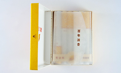 百年浓香这款新品的包装还是很符合黄金叶的一贯风格,明黄色和大红色搭配,显得相当醒目,而黄金叶上方的百年浓香四个小字又是印在像是软包横签样式的地方,诈一看还以为是软包香烟呢。