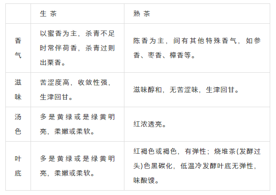 生茶与熟茶在茶性方面已经有了很大的区别,因此品饮时在感官方面也有完全不一样的表现。表格中对比了生茶与熟茶的几项主要感官指标:
