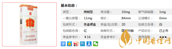 类型 :烤烟型 焦油量 :10mg 烟气烟碱量 :1mg 一氧化碳量 :11mg
