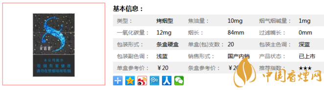 | 类型 :烤烟型 | 焦油量 :8mg | 烟气烟碱量 :0.8mg | 一氧化碳量 :10mg |