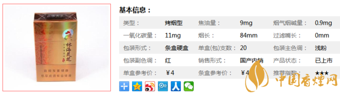 | 类型 :烤烟型 | 焦油量 :9mg | 烟气烟碱量 :0.9mg | 一氧化碳量 :11mg |