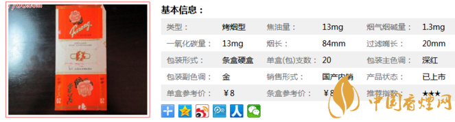 | 类型 :烤烟型 | 焦油量 :13mg | 烟气烟碱量 :1.3mg | 一氧化碳量 :13mg |