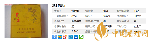 | 类型 :烤烟型 | 焦油量 :8mg | 烟气烟碱量 :1mg | 一氧化碳量 :8mg |