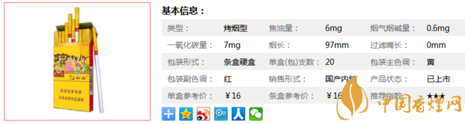 | 类型 :烤烟型 | 焦油量 :6mg | 烟气烟碱量 :0.6mg | 一氧化碳量 :7mg |