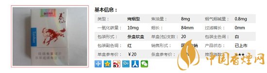 | 烟长:84mm | 过滤嘴长:25mm | 包装形式:条盒软盒 | 单盒(包)支数:20 |