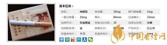 | 类型 :烤烟型 | 焦油量 :10mg | 烟气烟碱量 :1mg | 一氧化碳量 :10mg |