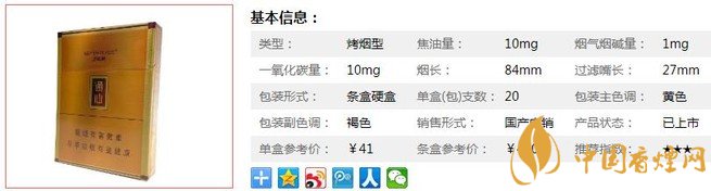 类型 :烤烟型 焦油量 :10mg 烟气烟碱量 :1mg 一氧化碳量 :10mg